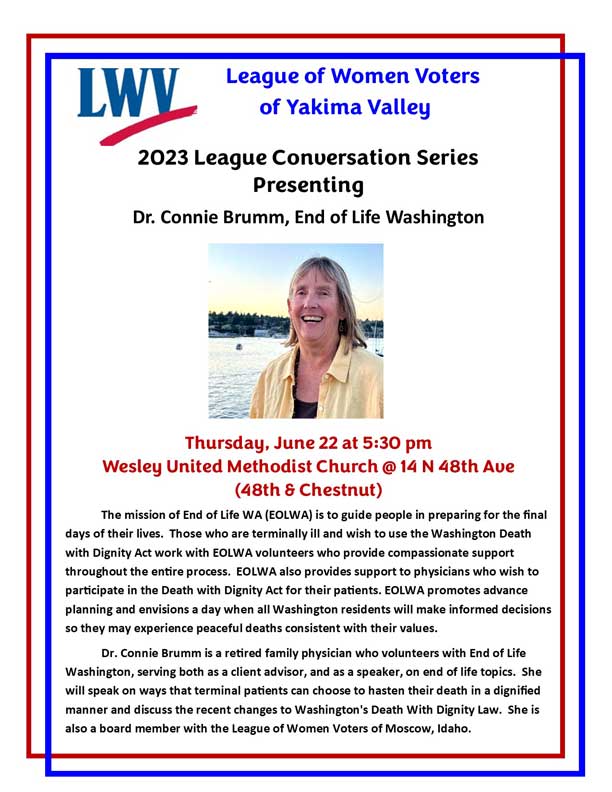 Dr. Connie Brumm is a retired family physician who volunteers with End of Life Washington, serving both as a client advisor, and as a speaker, on end of life topics. She will speak on ways that terminal patients can choose to hasten their death in a dignified manner and discuss the recent changes to Washington’s Death With Dignity Law. She is also a board member with the League of Women Voters of Moscow, Idaho.
